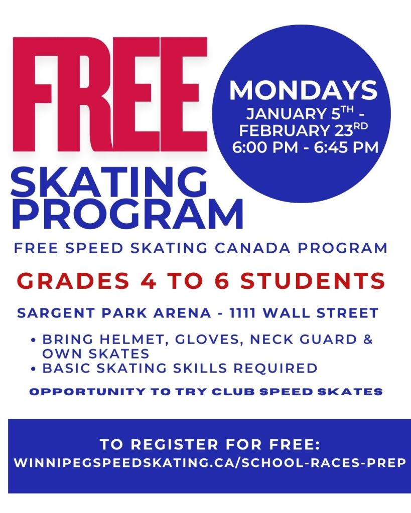 Speed Skating Winnipeg FREE 7-Week Program at Sargent Park Mondays @ 6:00 pm Posted by mhilland1 on December 4, 2025December 4, 2025 Click here to register Share this:TweetLike Loading... Related